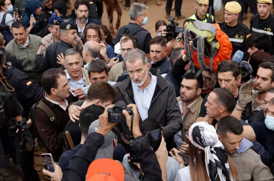 Tanto al rey como al jefe del Consell se les ha visto con manchas de barro en la cara y en la ropa. Se han escuchado gritos de 'asesinos', 'fuera', 'ayuda', 'Mazón dimisión' o 'Pedro Sánchez dimisión'.