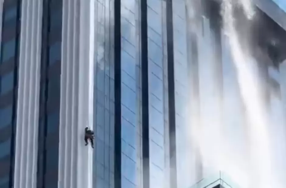 El trabajador estaba suspendido de uno de los laterales del edificio por medio de un arnés de seguridad unido a una soga de protección a la que tuvo que agarrarse cuando, producto de los movimientos tectónicos, el agua de la pileta ubicada en la terraza del edificio desbordó y comenzó a caer. En las imágenes se puede ver cómo agacha la cabeza y usa la cuerda para poder bajar del edificio.