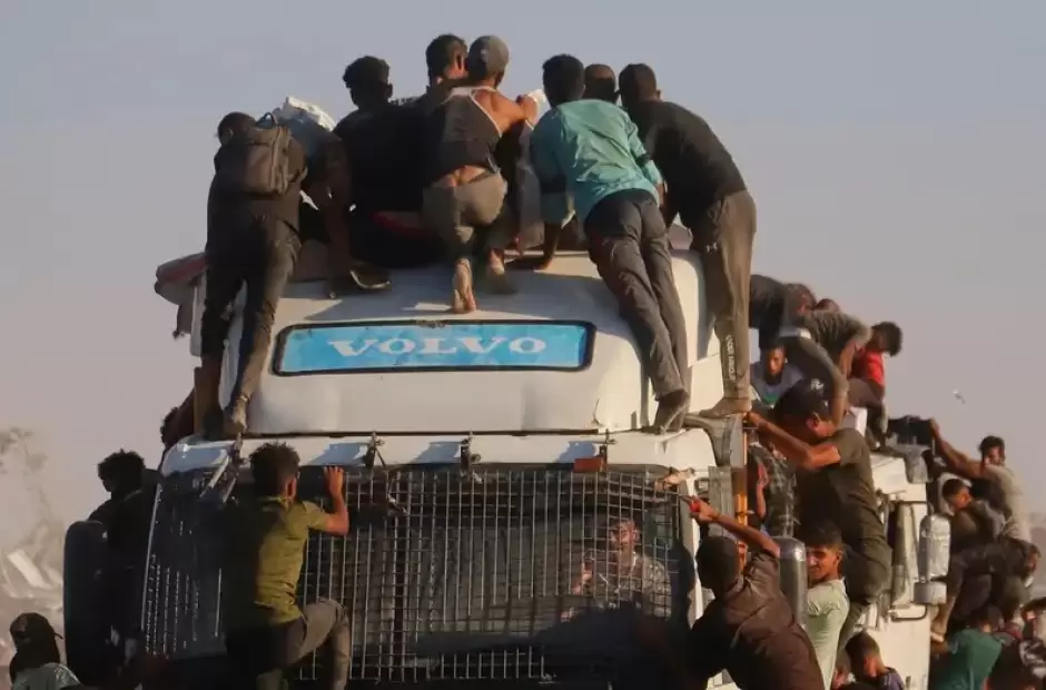 Un video filmado esta semana mostró cómo dos camiones que ingresaban al sur de Gaza fueron literalmente desbordados por multitudes.