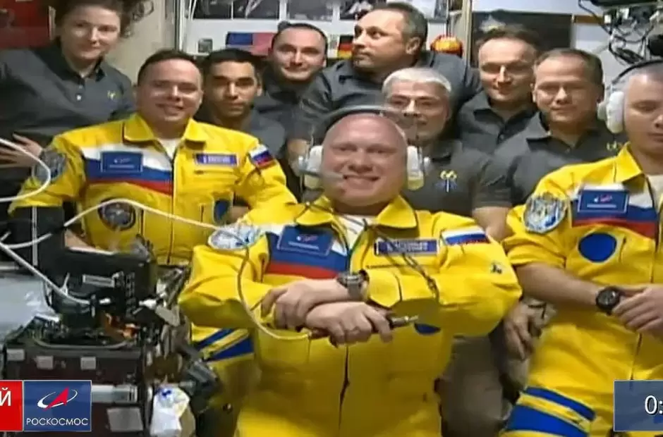 Y agregó: “Los trajes de vuelo de la nueva tripulación llevan los colores del emblema de la Universidad Técnica Estatal Bauman de Moscú, en la que se graduaron los tres cosmonautas... Ver la bandera ucraniana en todas partes y en todo, es una locura”. Por su parte, el director de la agencia rusa (Dmitri Rogozin) aseguró que Artemyev, Matveyev y Korsakov no simpatizan con los nacionalistas ucranianos.