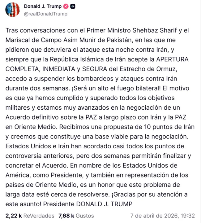 Trump fue enfático al señalar: "Siempre que la República Islámica de Irán acepte la APERTURA COMPLETA, INMEDIATA y SEGURA del Estrecho de Ormuz, accedo a suspender los bombardeos y ataques contra Irán durante dos semanas. ¡Será un alto el fuego bilateral!".