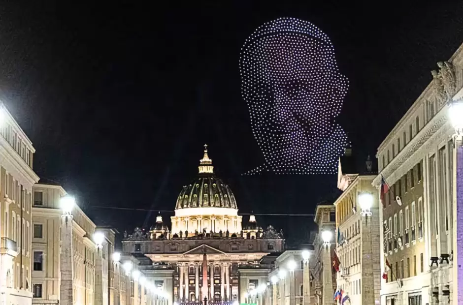 La Plaza de San Pedro, en el corazón del Vaticano, fue escenario este sábado de un espectáculo inédito que combinó innovación tecnológica, música y espiritualidad. Ante una multitud, más de 3.500 drones se elevaron sobre Roma para formar en el cielo la imagen del papa Francisco, en un tributo cargado de simbolismo.