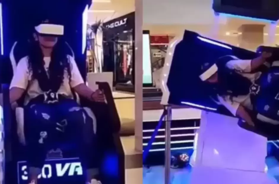 La joven llevaba puestos unos lentes de realidad virtual, por lo que no veía lo que pasaba. Pero, cuando el aparato comenzó a moverse y girar, chocó con uno de los parantes que servía para acordonar la zona y el simulador terminó en el suelo.