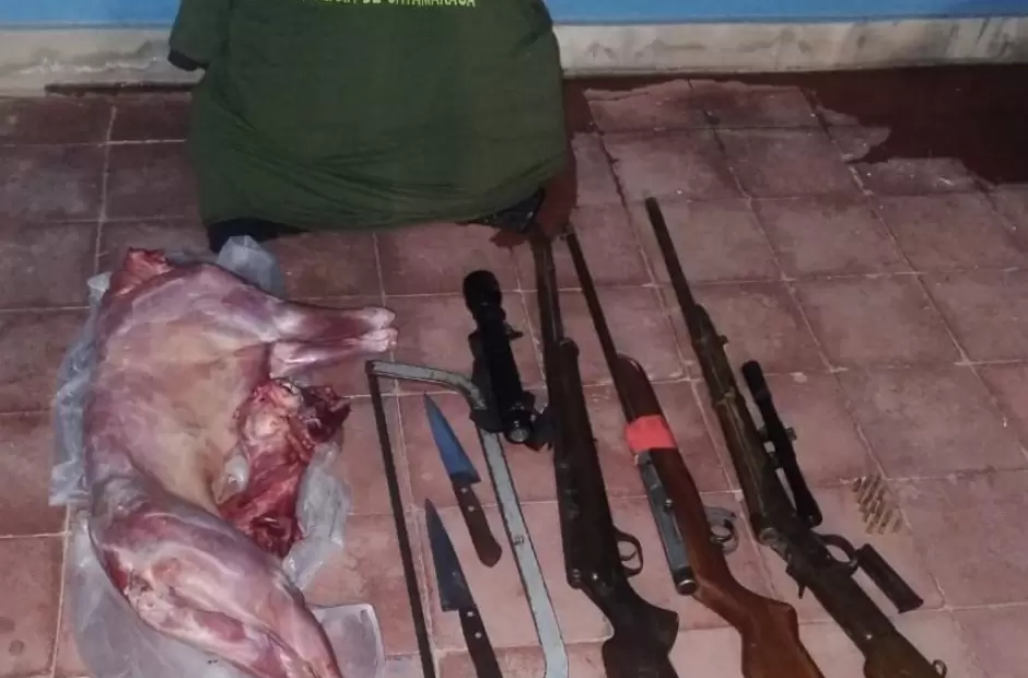 Luego de una serie de investigaciones, los efectivos llevaron a cabo un allanamiento en la vivienda de un hombre de apellido Pacheco, de 36 años. Durante el registro, se encontraron: una escopeta calibre 24, una carabina calibre 22 con cargador y dos cartuchos, una carabina calibre 22 sin cargador, catorce cartuchos calibre 22, una mira telescópica, una linterna de caza con batería, una sierra tipo carnicero, dos cuchillas y una cabra faenada de aproximadamente 12 kilogramos.