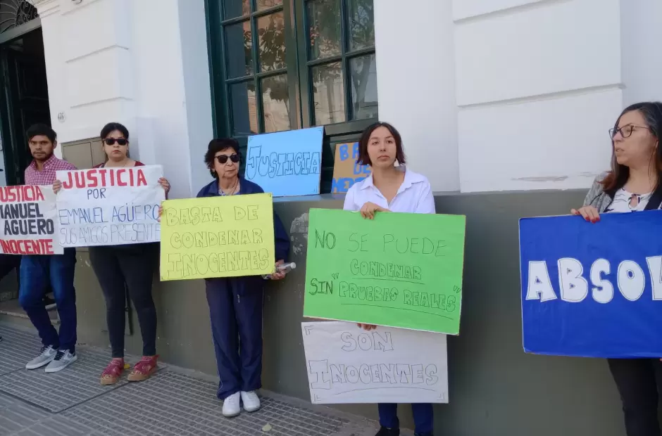 Mientras en el interior del salón San Martín se realizaba la audiencia de la que fue parte también el ministerio público fiscal representado por el Dr. Alejandro Dalla Lasta y la querella a cargo de los Dres. Claudio y Fernando Contreras, en las afueras del edificio judicial, más precisamente sobre la vereda de la Corte, familiares y amigos de Leiva y Agüero se manifestaron pacíficamente con pancartas pidiendo “justicia” para los jóvenes condenados.