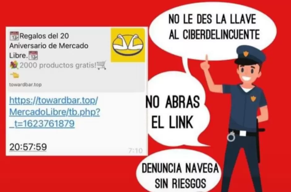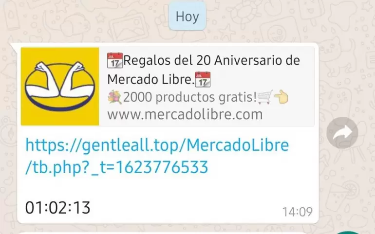 "Regalos del 20 aniversario de Mercado Libre. ¡2000 productos gratis!". Con esta atractiva propuesta, un mensaje falso circula a través de WhatsApp bajo el objetivo de robar datos de los usuarios del servicio de mensajería. Tanto la empresa de compra venta online como el Ministerio de Seguridad de la provincia advirtieron que el mismo es tramposo y que tiene como objetivo robar los datos de los usuarios del servicio.