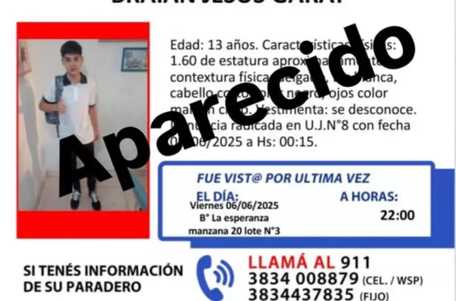 Tras agradecer a la comunidad por colaborar para dar con el paradero del menor, no se dio más información sobre lo sucedido con Braian Jesús Garay. Recordemos que la familia había radicado la denuncia en la Unidad Judicial n°8.