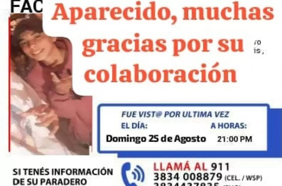 La División Trata de Personas difundió a través de sus redes sociales que tras una intensa búsqueda apareció Facundo Ismael Contreras, un joven de 20 años de edad que fue visto por ultima vez en la tarde del domingo 25 de agosto de 2024.