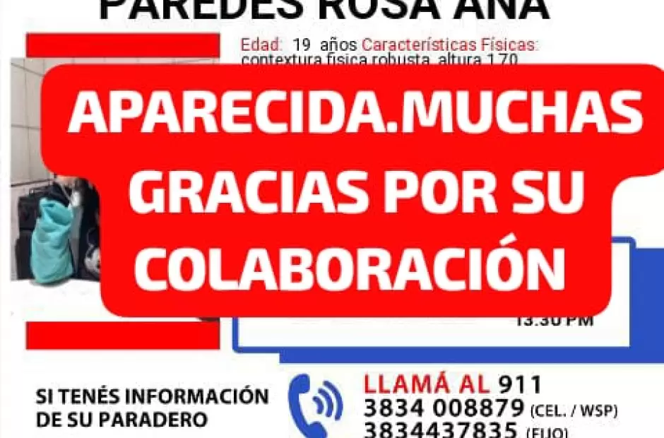 Así fue confirmado por la Policía de la provincia, indicando que Rosa Ana Paredes, ya fue ubicada.