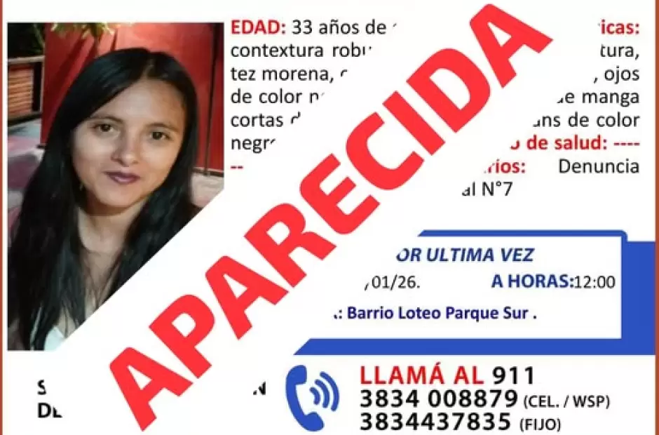 La mujer era buscada desde el 20 de enero de 2026, fecha en la que fue vista por última vez en horas del mediodía, alrededor de las 12:00, en el barrio Loteo Parque Sur, según los datos aportados en la denuncia formal. A partir de ese momento, se inició un operativo de búsqueda que incluyó la difusión pública de su imagen y características físicas, con el objetivo de recabar información que permitiera dar con su paradero.