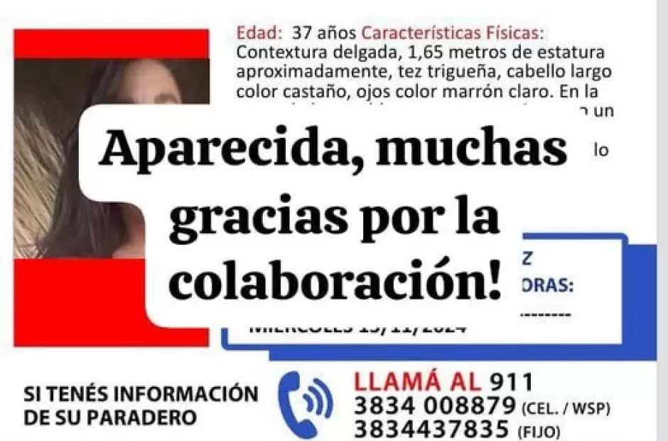 Desde las redes oficiales de la policía de la provincia, informaron este domingo la aparición de Lays Fentanes Salgueiro, una mujer de 37 años que desde el pasado miércoles de 13 de noviembre estuvo ausente junto a su hijo de un año.