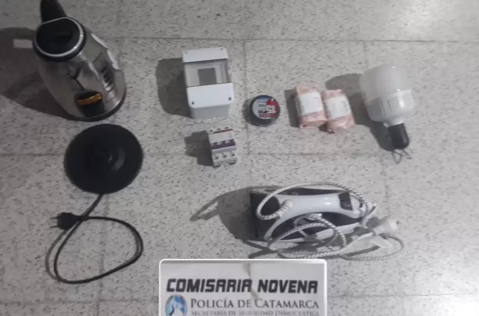 De esta manera personal policial le secuestro una pava eléctrica, una plancha, una llave térmica tripolar con su caja, un foco de 30 am. entre otros elementos.