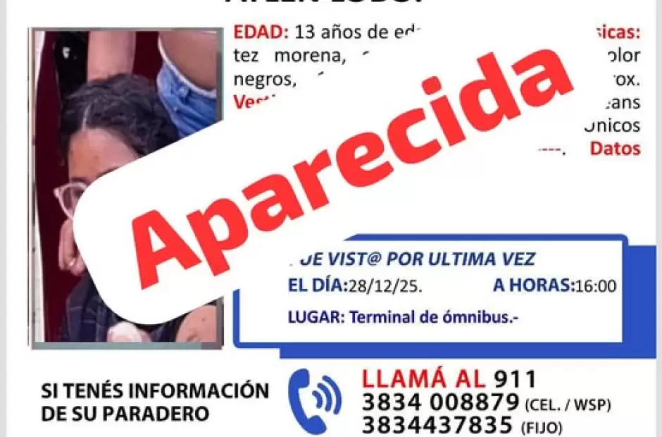 Luego de varias horas de incertidumbre y una intensa búsqueda que movilizó a fuerzas de seguridad, familiares, amigos y a la comunidad, la Policía de la provincia confirmó cerca del mediodía la aparición de Aylen Lobo, la adolescente de 13 años que se encontraba ausente desde la tarde del sábado.