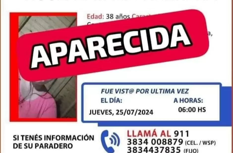 La mujer de 38 años,  Rosa Natalie Herrera, que estaba desaparecido desde el jueves pasado fue reportada como aparecida. Así lo informó la Policía de Catamarca junto a la Divisional de Investigaciones y de Trata de Personas.
