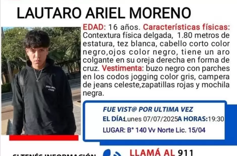 La División Trata de Personas, difundió a través de sus redes sociales, en un llamado a la comunidad, que se busca dar con el paradero de Lautaro Ariel Moreno , un adolescente de 16 años de edad, quien fue visto por ultima vez el lunes a la 19:30 horas de la tarde en el Barrio 140 Viviendas Norte.