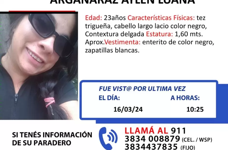 Según la denuncia, Argañaraz tiene contextura física delgada con una altura de 1,60 y es de tez trigueña con cabello largo negro. En cuanto su vestimenta al momento de desaparecer un enterito de color negro, zapatillas blancas.