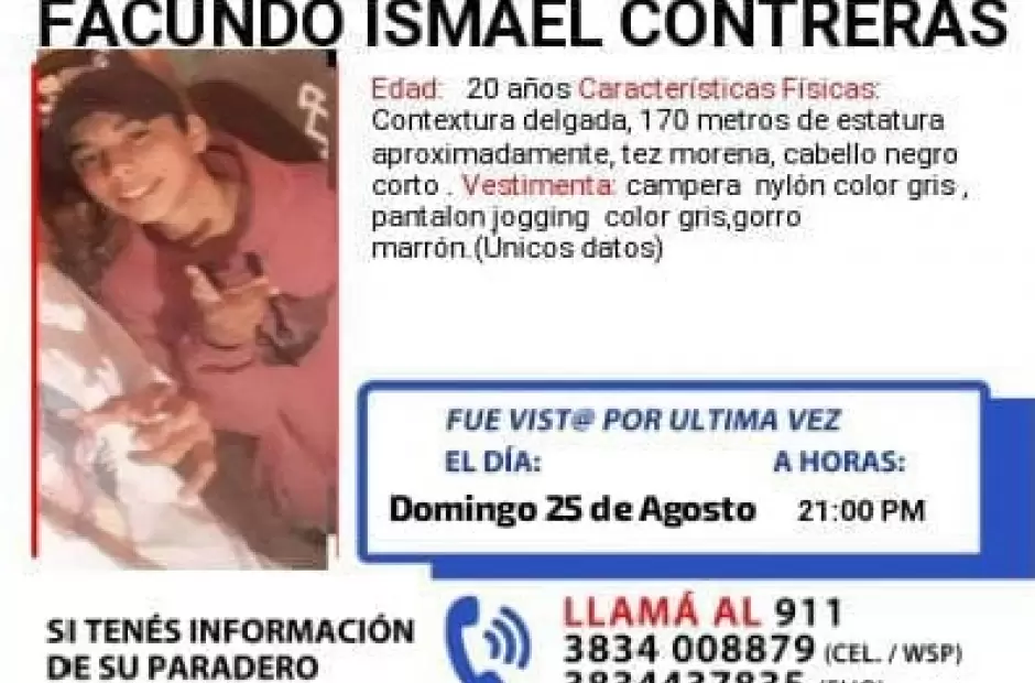 Según la denuncia, Contreras tiene contextura física delgada con una altura de 1,70, tez morena, cabello negro corto. En cuanto su vestimenta al momento de desaparecer, tenia una campera nylon color gris, pantalón jogging color gris y un gorro marrón.
