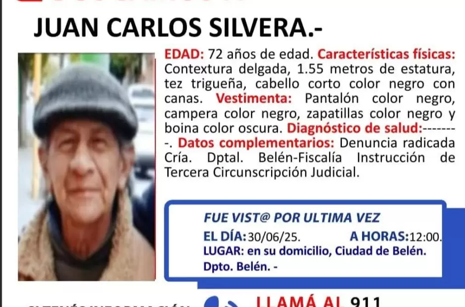 La División Trata de Personas, difundió a través de sus redes sociales, en un llamado a la comunidad, que se busca dar con el paradero de Juan Carlos Silvera , un hombre de 72 años de edad que fue visto última vez a las 12:00 horas del mediodía en su domicilio, departamento Belén.