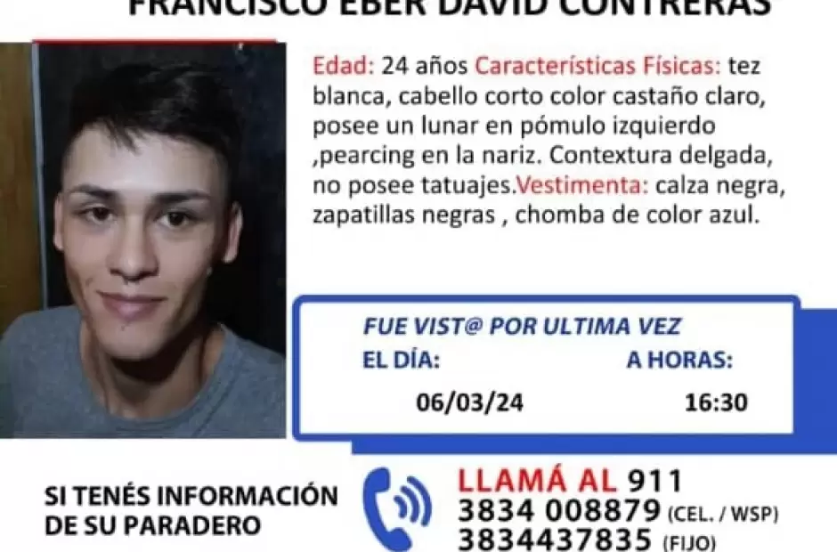 La División Trata de Personas difundió a través de sus redes sociales, en un llamado a la comunidad, que se busca a dar con el paradero de Francisco Eber David Contreras, quien tiene 24 años de edad y fue visto por ultima vez en la tarde del 06 de marzo del 2024.