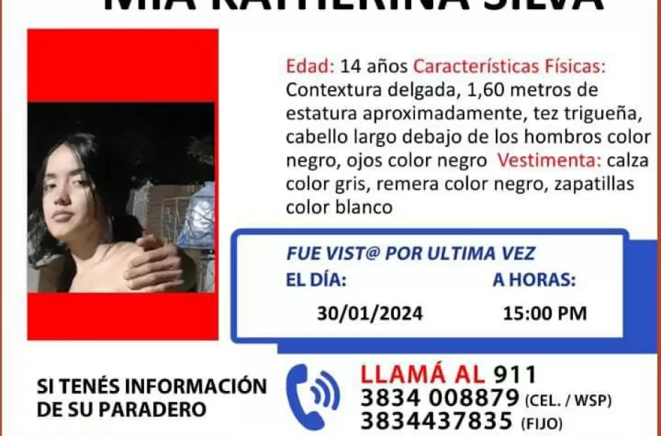 La división trata de personas difundió atreves de sus redes sociales, en un llamado a la comunidad, que se busca a dar con el paradero de Mia Katherina Silva, quien tiene 14 años de edad y fue vista por ultima vez en la tarde del 30 de enero de 2024.