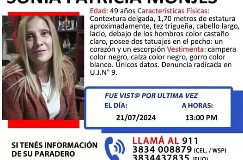 La División Trata de Personas difundió a través de sus redes sociales, en un llamado a la comunidad, que se busca dar con el paradero de Sonia Patricia Monjes, una mujer de 49 años de edad, que fue vista por ultima vez en la tarde del domingo 21 de julio de 2024.