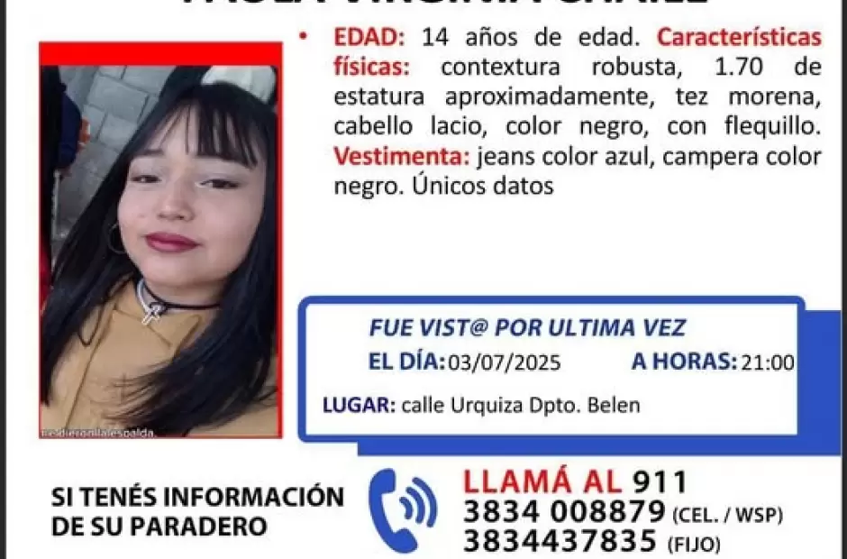 La Policía de la Provincia lanzó este martes un operativo de búsqueda para dar con el paradero de Paula Virginia Chaile, una adolescente de 14 años que permanece desaparecida desde el domingo por la noche en el departamento Belén.