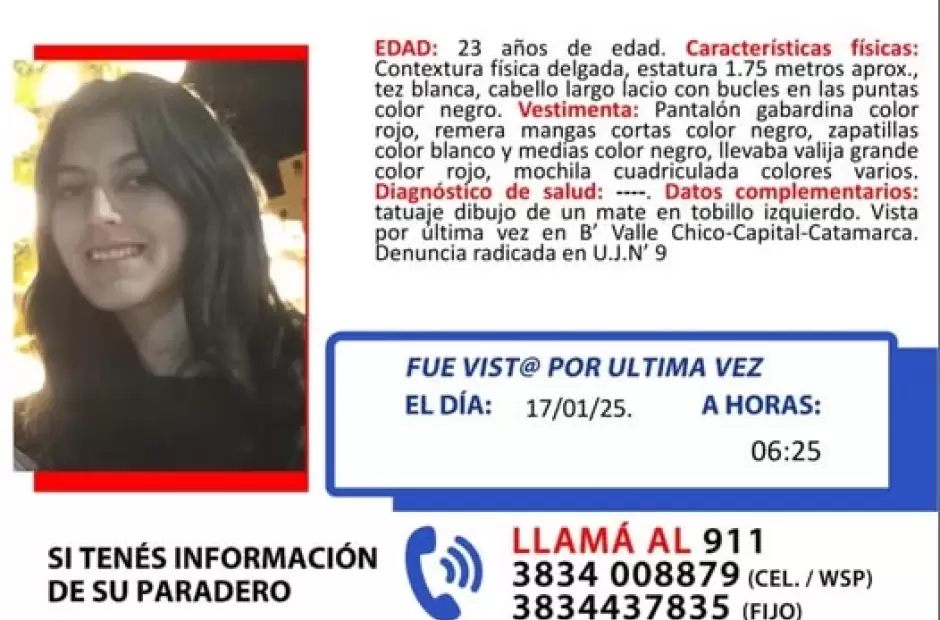 Ante cualquier información de su paradero, dirigirse de inmediato a la dependencia policial más cercana o comunicarse al 911 o a los números 3834-008879.