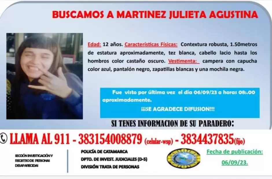 Se trata de Julieta Agustina Martínez de 12 años. Tiene contextura robusta, 1.50 metros de altura, tez blanca, cabello lacio hasta los hombros color castaño oscuro. Vestía una campera con capucha color azul, pantalón negro, zapatillas blancas y una mochila negra.