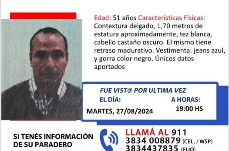Desde las redes oficiales de la policía de la provincia, solicitan ayuda de la comunidad para dar con el paradero de un hombre de 51 años, quien está desaparecido desde la tarde de ayer martes.