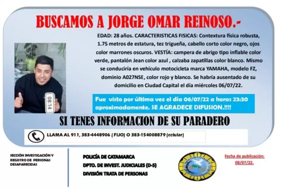 Según reportó la Policía de Catamarca, fue visto por última vez ese día a las 23:30 horas.