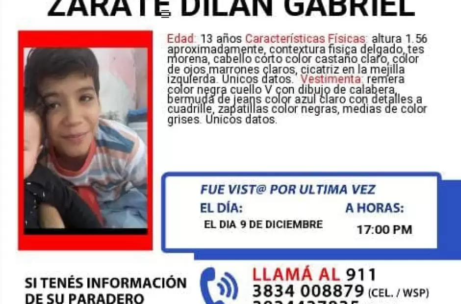 La Policía de la provincia solicita colaboración a la comunidad para poder dar con el paradero de un menor de 13 años. Se trata de Dilan Gabriel Zarate, quien está ausente desde este lunes a las 17 hs.