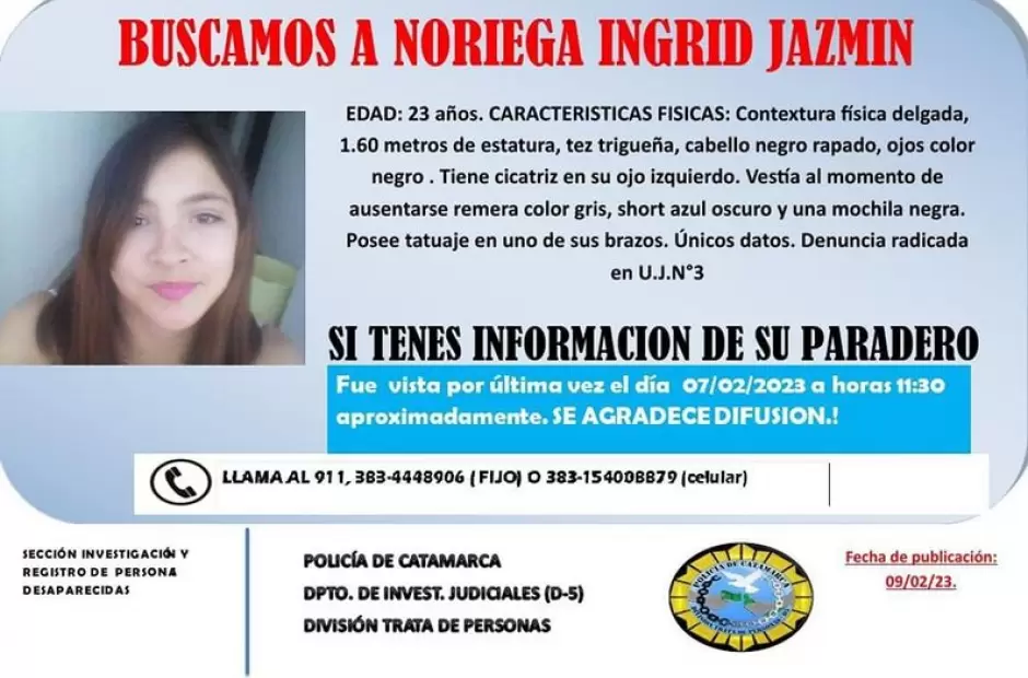 Este jueves la Policía de Catamarca dio a conocer que busca intensamente a una joven de 23 años. Se trata de un Ingrid Jazmín Noriega, quien fue vista por última vez el pasado 7 de febrero a las 11:30 de la mañana.