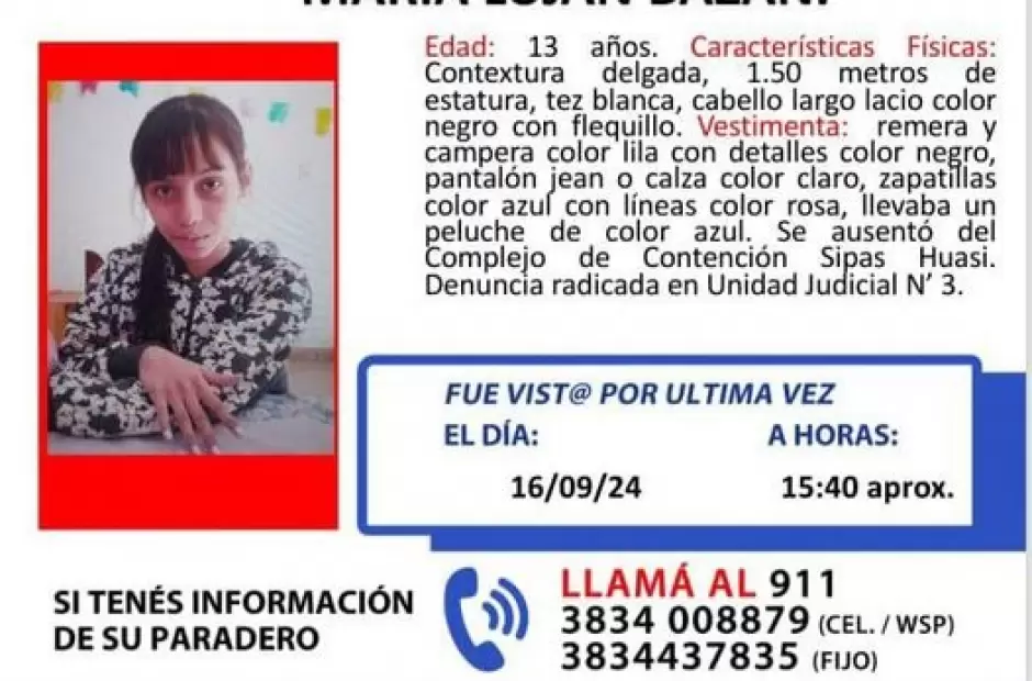 La menor está ausente del Complejo de contención Sipas Huasi, Hogar de Niñas, desde las 15:40 hs. de este lunes 16 de septiembre.