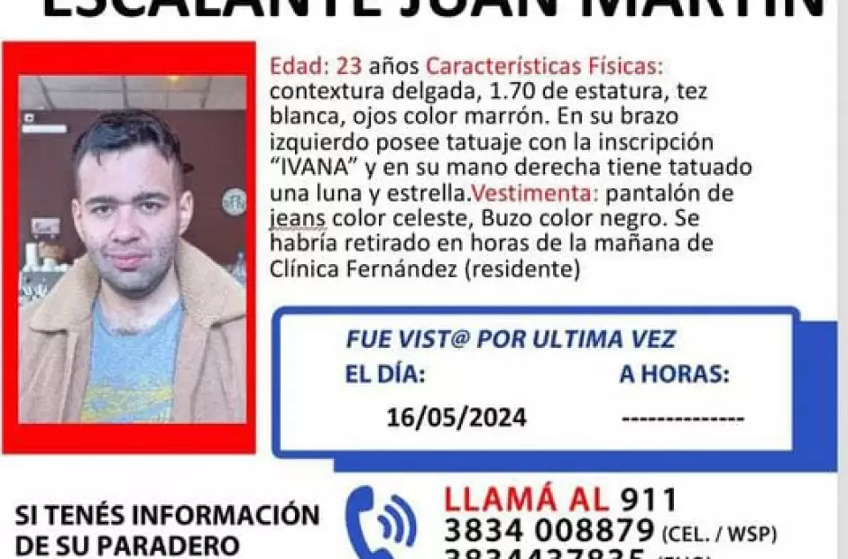 La Policia de la provincia solicita a la comunidad colaboración para dar con el paradero de Juan Martín Escalante, un joven de 23 años que fue visto por última vez este jueves, más precisamente en horas de la mañana en la Clínica Fernández, de donde es residente.