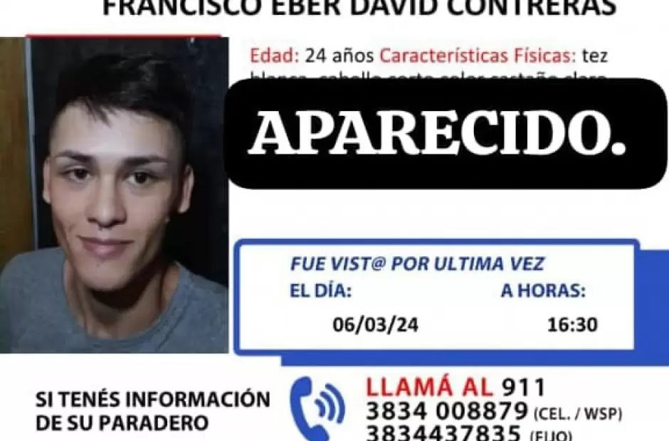 La División Trata de Personas difundió a través de sus redes sociales el día de hoy sobre la búsqueda de un joven de 24 años, identificado como Francisco Eber David Contreras, de 24 años de edad, quien fue visto por última vez en la tarde del 06 de marzo del 2024. En la última hora de este domingo, publicaron que el joven fue encontrado, dando por finalizada la búsqueda.