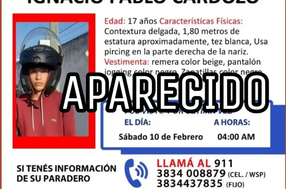 Desde la página oficial de la Policía de la provincia, en trabajo conjunto con la División Trata de Personas, Sección investigaciones y registro de personas desaparecidas y el Departamento de Investigaciones (D-5), informaron la aparición de un adolescente de 17 años, identificado como Ignacio Pablo Cardozo, quien se ausentó de su hogar desde las 04:00 de la madrugada de este sábado 10 de febrero.