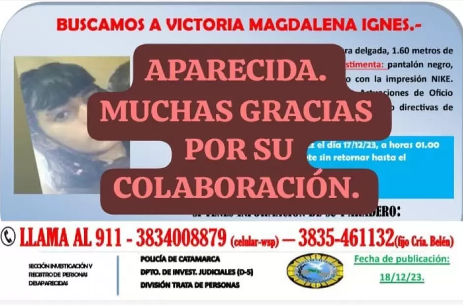 Victoria Magdalena Ignes es oriunda del departamento Belén, y estuvo desaparecida desde ayer.