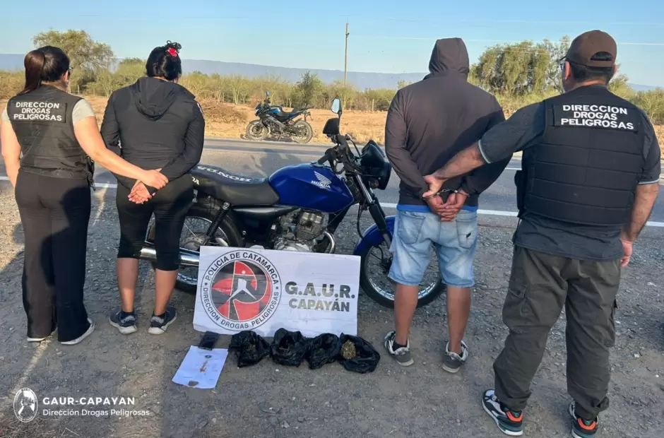 El procedimiento fue llevado a cabo por efectivos del Grupo Antinarcóticos de Unidades Regionales (GAUR-Capayán), en la Ruta Nacional N° 38 a la altura de la localidad de Huillapima. Allí interceptaron una motocicleta Honda CG Titán 150 cc. de color azul, en la que circulaban un hombre de 43 años y una mujer de 32, ambos oriundos de la Capital.