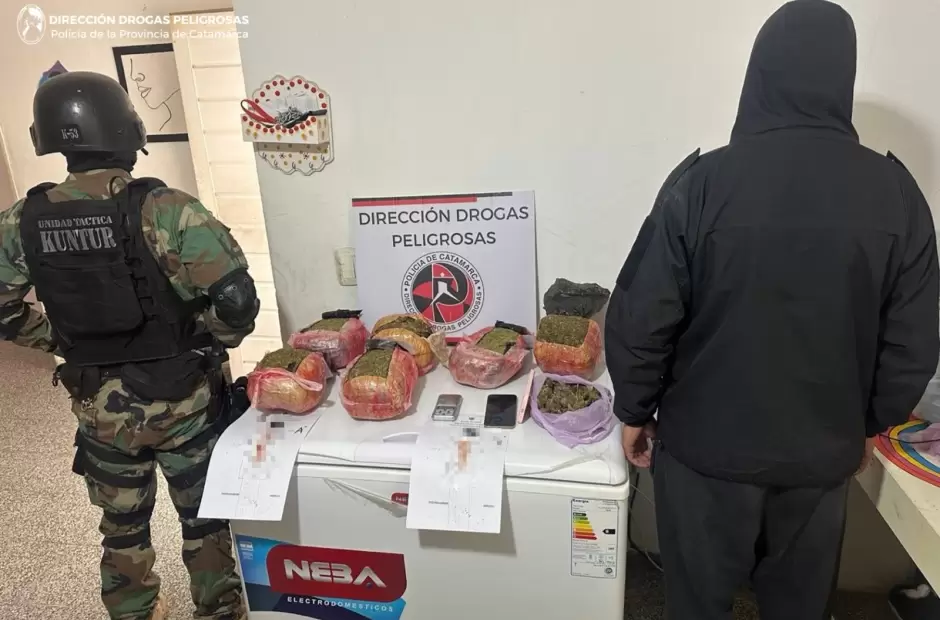 Seguidamente y continuando con las pesquisas, conjuntamente con personal de la Dirección de Operaciones Especiales Kuntur, efectivos de Drogas Peligrosas materializaron un allanamiento en una vivienda ubicada en la calle N° 26, de Valle Chico, donde incautaron seis paquetes compactados y una bolsa de plástico, con unos 6,795 Kg. de marihuana, como así también hicieron lo propio con un iPhone 13 Pro Max y una balanza tipo gramera.
