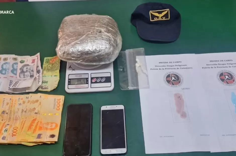 Cabe señalar que, al solicitarles que exhibieran sus pertenencias, los policías observaron que los sujetos llevaban una mochila, que en su interior contenía dos envoltorios de plástico y un paquete compactado con sustancias tipo polvo de color blanco y herbácea respectivamente, por lo que de inmediato solicitaron la presencia de sus pares del Grupo Antinarcóticos de Unidades Regionales (GAUR-Recreo), quienes llevaron a cabo la prueba de campo correspondiente, que arrojó como resultado que se tratarían de Cocaína y unos 966 gramos de marihuana, que quedaron en calidad de secuestro al igual que el rodado, dos teléfonos celulares y la suma de $107.500 en efectivo.