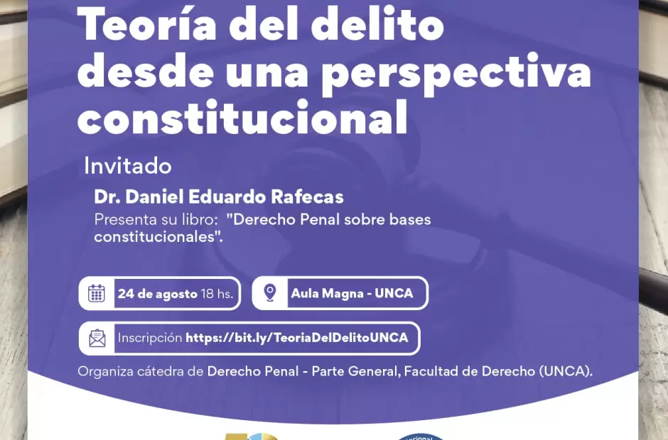 La Facultad de Derecho de la UNCA recibe el próximo 24 de agosto al destacado jurista Daniel Eduardo Rafecas, quien en ámbitos del aula Magna "Federico Emiliano Pais", brindará una Conferencia sobre "Teoría del delito desde una perspectiva constitucional". En la oportunidad, Rafecas, presentará su libro "Derecho Penal sobre bases constitucionales".