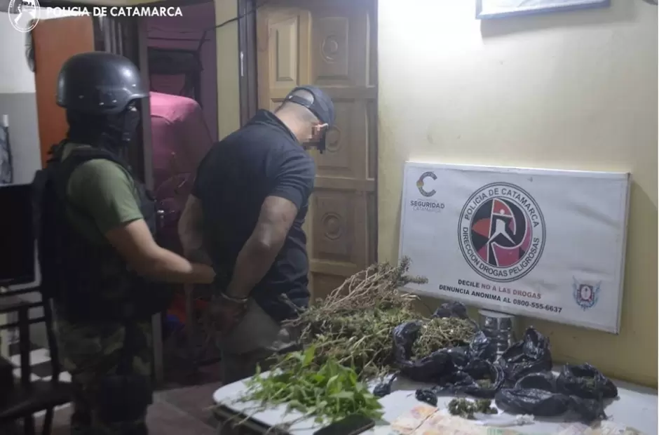 Tras irrumpir en un inmueble del barrio 50 Viviendas de la localidad de Santa Rosa, departamento Valle Viejo, los policías requisaron todo el inmueble y, al finalizar la medida, secuestraron un kg de cogollos de marihuana y un teléfono celular Motorola. Además, los investigadores incautaron la suma de sesenta y nueve mil setecientos ochenta pesos, discriminados en billetes de distinta denominación y diecisiete plantines de marihuana de entre 10 y 30 cm., que estaban siendo cultivados.