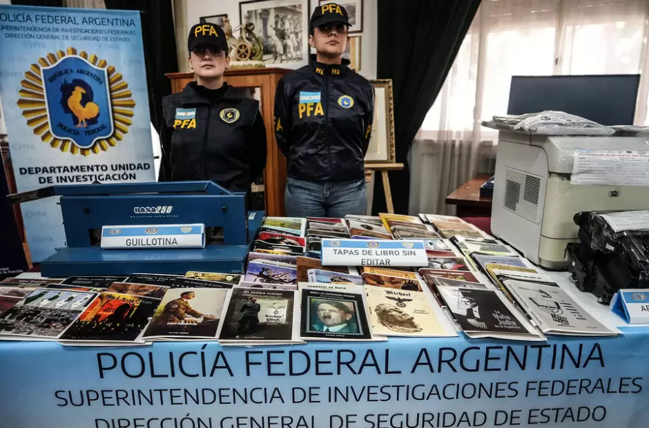 “Estamos sorprendidos con la cantidad de material, es una verdadera imprenta de difusión y venta de simbología, libros y adoctrinamiento nazi”, afirmó el jefe de la PFA, Juan Carlos Hernández, en una conferencia de prensa.