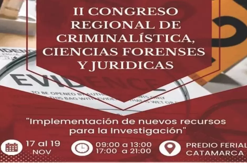 El Congreso Regional Criminalística, Ciencias Forenses y Jurídicas, cuyo lema es “Implementaciones de nuevos recursos para la investigación” estará a cargo de profesionales de alto nivel Internacional, nacional y local, implementándose dicho dictado con la modalidad curso-taller en horario matutino de 8 a 12 y vespertino de 16 a 20 horas, desarrollándose el mismo en el Predio Ferial Catamarca. La temática a abordar en dicho evento de interés Jurídico-Criminalístico, tiene como objetivo brindarles a los participantes nuevas herramientas y metodologías que les permita desde el rol funcional que cumple cada uno en la sociedad, desarrollar un trabajo más eficaz y eficiente para, principalmente, ayudar al esclarecimiento de diferentes hechos delictivos que se presentan a diario en nuestra provincia.