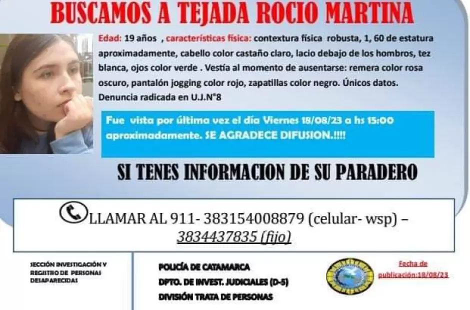 La División Trata de Personas de la Policía de la Provincia comunicó que se busca dar con el paradero de Rocio Martina Tejada, de 19 años de edad, quien se encuentra desaparecida desde la tarde de este viernes.