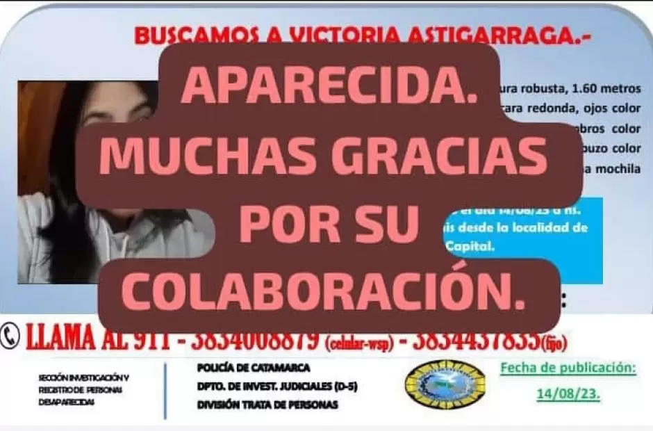 Afortunadamente, la Policía de la Provincia acaba de publicar en su página oficial que Victoria Astigarrapa fue encontrada y agradecen la colaboración de la comunidad al compartir la imagen de la chica para que se difunda sobre su desaparición.