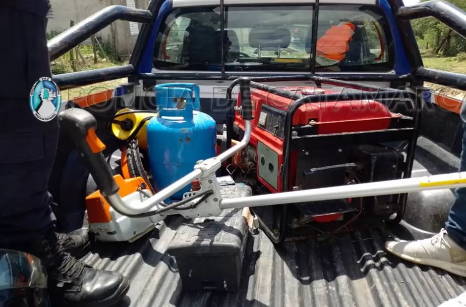 Continuando con la investigación, pasado el medio de ayer, a las 12:30, a solicitud de la fiscalía interviniente materializaron una orden de allanamiento, en un domicilio de la Villa El Alto, propiedad de una familia de apellido Mercado, donde encontraron oculto entre las malezas de gran tamaño, un grupo electrógeno Briggs & Stratton, de color rojo, una moto guadaña de explosión Stihl, de color naranja, una mochila de fumigar Giber, de color amarillo y celeste, una garrafa de 10kg., una bomba de agua y una caja con herramientas varias, que quedaron en calidad de secuestro.