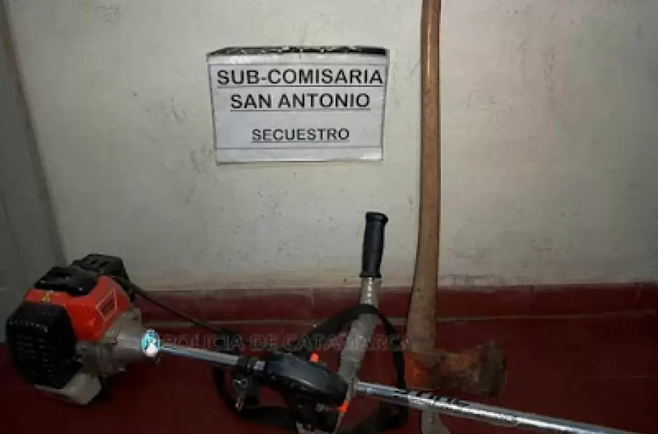 En la noche de ayer, a las 20:25, alertados por un llamado telefónico, efectivos de la Subcomisaría de San Antonio se constituyeron en un domicilio de la calle Gaspar Guzmán S/N°, de esa localidad del Departamento Fray Mamerto Esquiú, donde se entrevistaron con un hombre de 37 años de edad, quien manifestó que en el fondo del inmueble habría una persona del sexo masculino intentando saltar la tapia, luego de sustraer una motoguadaña marca Stihl, de colores anaranjado y negro, y un hacha de su propiedad, por lo que rápidamente los policías aprehendieron a un joven de apellido Monferran, de 26 años de edad, quien durante el procedimiento habría intentado agredir físicamente al personal policial interviniente con el hacha, no logrando su cometido.