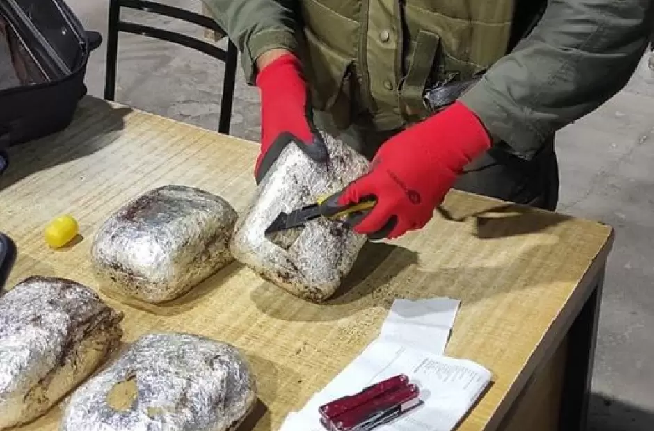 Luego de identificar a los pasajeros, el personal a cargo del procedimiento conjuntamente con el perro detector de narcóticos, se dirigió al sector de la bodega, donde 'marcó´ la presencia de estupefaciente dentro de una valija. Inmediatamente, en presencia de testigos, los funcionarios contabilizaron cinco paquetes rectangulares que estaban recubiertos con café, los cuales contenían 4 kilos 677 gramos de marihuana, según el resultado de la prueba campo Narcotest efectuada por personal de Criminalística y Estudios Forenses. Además hallaron un recipiente con restos de café entre las pertenencias de un pasajero mayor de edad.