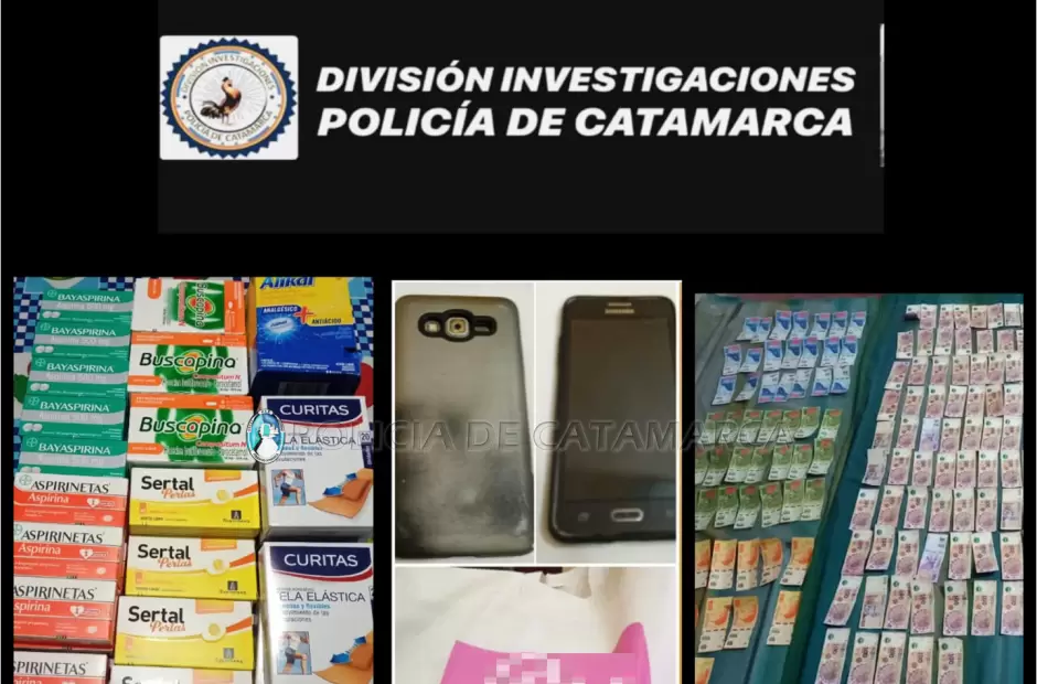 Tras una ardua tarea investigativa, personal de la División Investigaciones diagramó un operativo cerrojo en inmediaciones al lugar de encuentro acordado y procedió a la aprehensión de un hombre de apellido Barrionuevo (35), y más tarde, conjuntamente con sumariantes del mencionado Precinto Judicial, los policías materializaron una orden de allanamiento en el inmueble del aprehendido, ubicado en el pasaje Clero Ahumada al 100, donde lograron recuperar $48.000, como así también siete cajas de Aspirinetas, cinco cajas de Sertal, una caja de Alikal, cinco cajas de Bayaspirina, y cuatro cajas de Curitas, que quedaron en calidad de secuestro, al igual que un teléfono celular Samsung negro, que sería de interés para la causa.